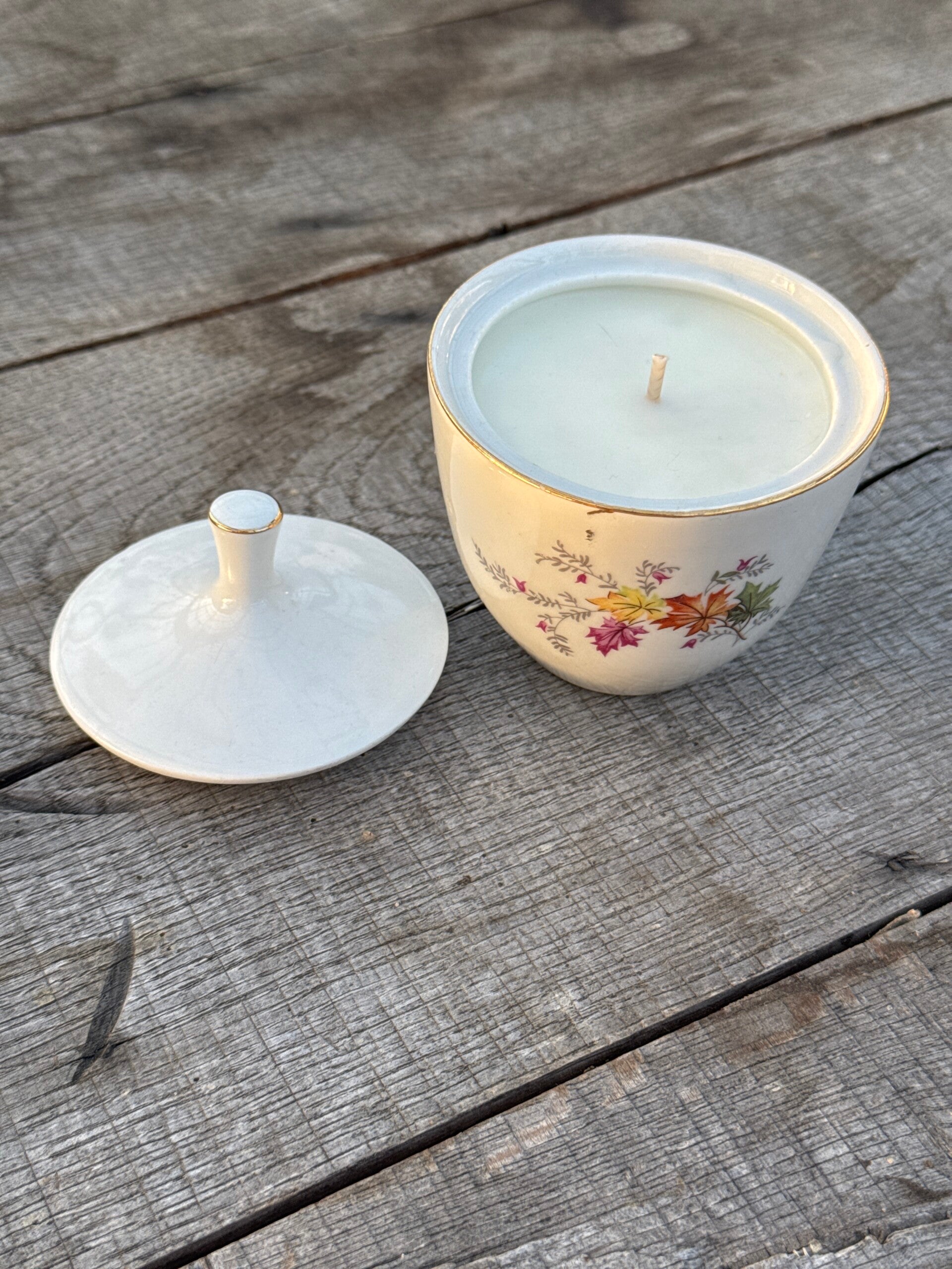 Les bougies parfumées sont coullées dans d'élégants sucriers fleuris vintage.